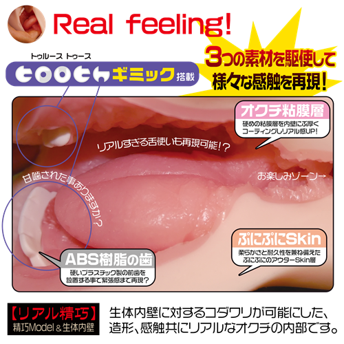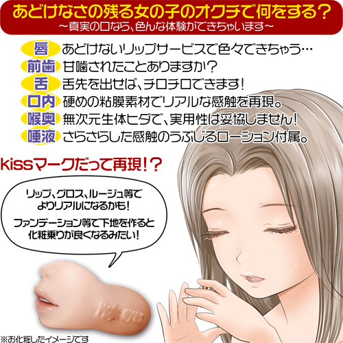 口交,怕你有牙?咬你!Kiss × penis 真實之口,口交再也不是虛無飄渺的感覺了,口交著重舒服,其次是刺激。就由她的唇為你吻開這片天地,柔軟的舌頭,舔開你敏感的開關,厚厚的舌給予至真的感覺,舌動你的所有,感受我的上顎,無與倫比的真實,將要帶走你的疑惑,小心撞到她的喉嚨椗,為你深喉。啜走你的煩憂,多層 非貫通 無次元的構造,令内部無論真空的吸力 口腔肉璧的磨擦力 口交的真實度,都一一重現於 真實之口!