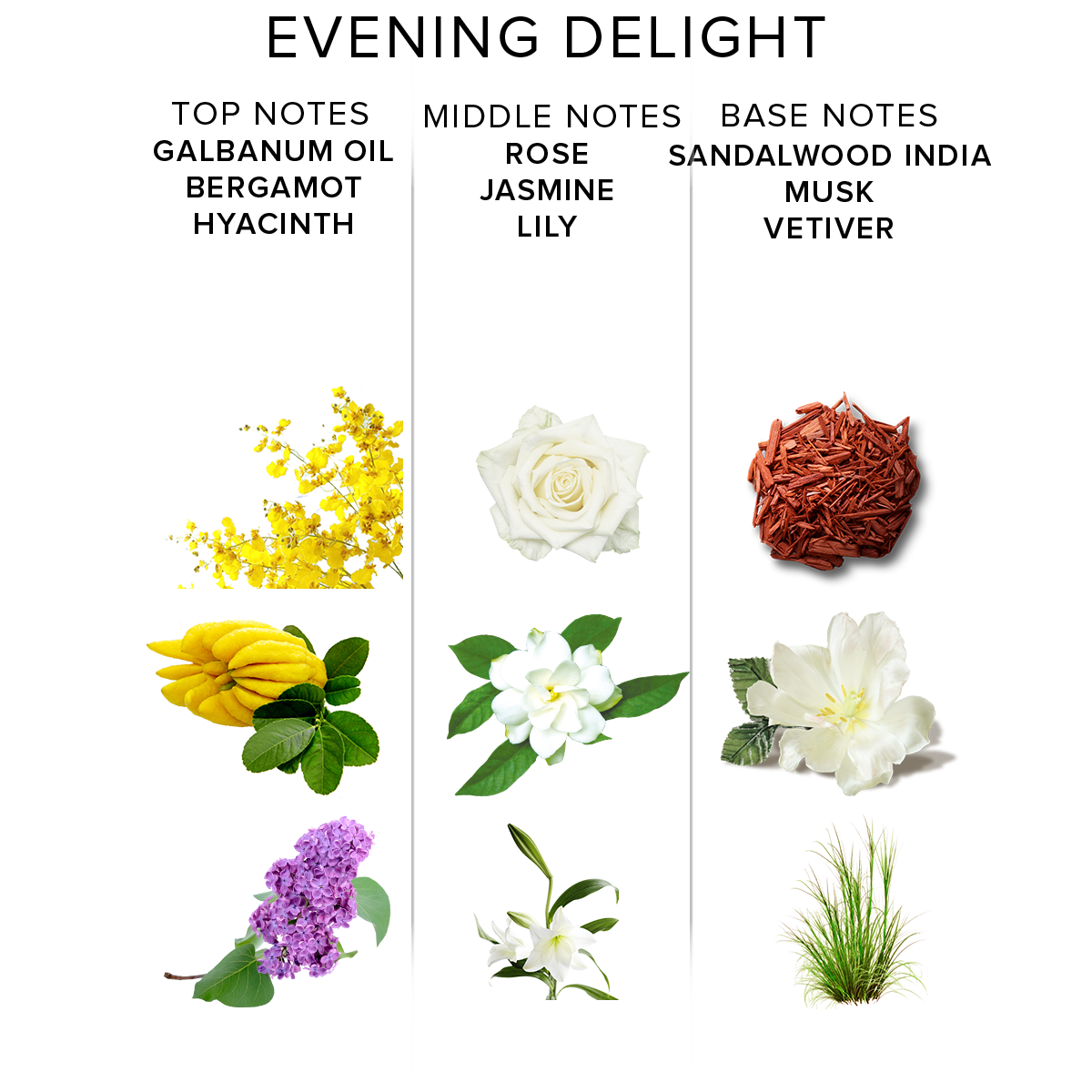 Evening Delight是女士吸引異性專用的費洛蒙香水。火辣的印度檀香配上清新淡雅的花香, 是屬於傍晚時份的迷人香氣 感覺矛盾又神秘迷人, 令他想佔有更多。 特別適合晚間使用。