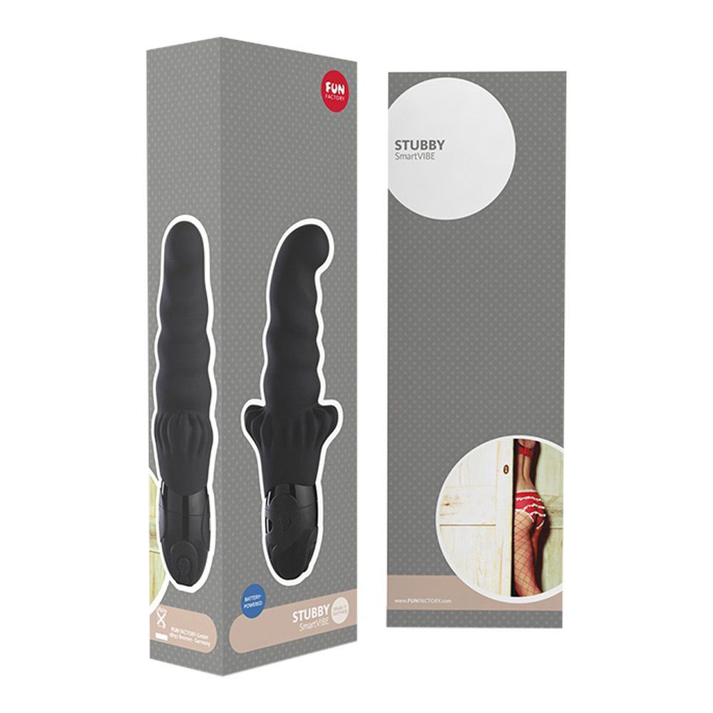 在內部增壓裝置的創新設計下,Stubby的深入,會給您手指觸摸般的緊實。該振動器是專門為適應情人身體而量身定做的。其外形短小精悍,動力十足,低端凸起的邊緣,用來刺激陰蒂,而彎曲的尖頭給G點強烈的按摩感受。由於它低端的突起,可防止完全插入,此產品也適合肛交愛好者使用, 給您肛門週邊更好的按摩享受